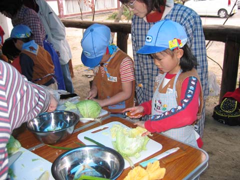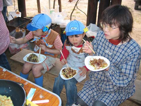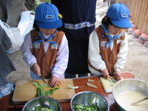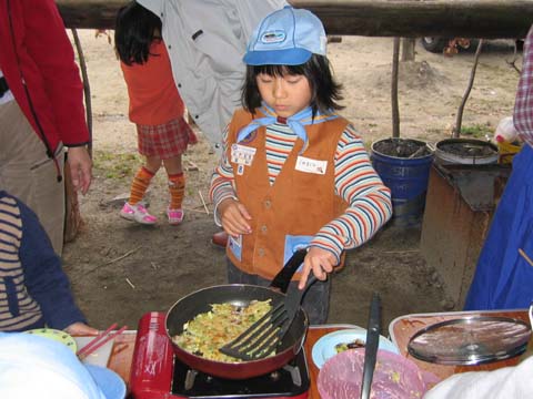 「ビーバーも、キャベツやネギを切れる!」と言うことで、お好み焼きを作りました。 家庭でやってる子は上手だね! 切ってる 切ってる 焼いてる 焼いてる!