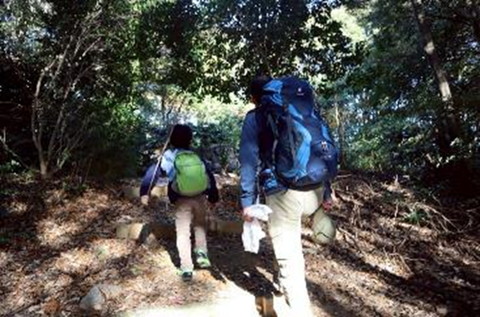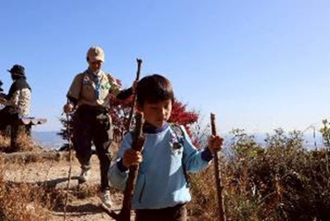 木の棒を杖にして、登り始めます!なかなか勾配あって息があがります スカウトは、へっちゃらで勢いよく登っていきます